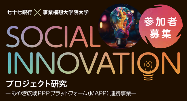 株式会社七十七銀行(頭取:小林英文)と学校法人先端教育機構 事業構想大学院大学(本部:東京都港区、学長:田中里沙)は、宮城・東北の地域課題解決及び新事業の創出を目的に、<七十七銀行×事業構想大学院大学>Social Innovation プロジェクト研究を共催します。本プロジェクトは、七十七銀行のみやぎ広域PPPプラットフォーム(以下、MAPP)の実行支援・官民対話機能を活用した取組みとなります。