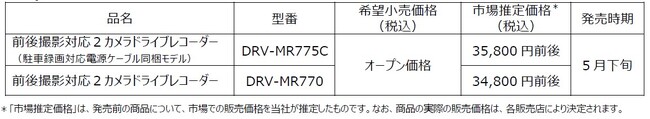 株式会社JVCケンウッドは、KENWOODブランドより、ドライブレコーダーの新ラインアップとして、前方と後方の同時録画に対応した前後撮影対応2カメラドライブレコーダー「DRV-MR775C」(駐車録画対応電源ケーブル同梱モデル)および「DRV-MR770」を5月下旬より発売します。