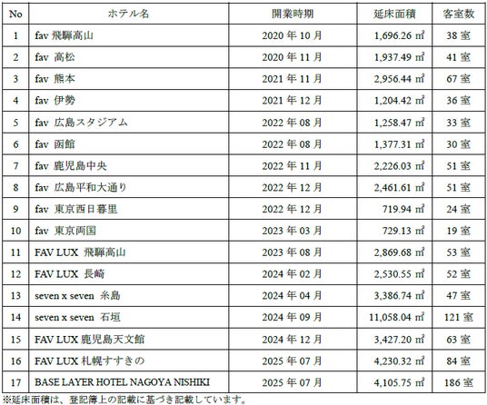 当社は、観光立国の実現や地域創生への貢献を目的にホテルの開発に取り組んでおり、多人数向け ホテルブランド『fav』『FAV LUX』『edit x seven』『seven x seven』、およびカルチャービジネスホテル『BASE LAYER HOTEL』を全国で展開しております。