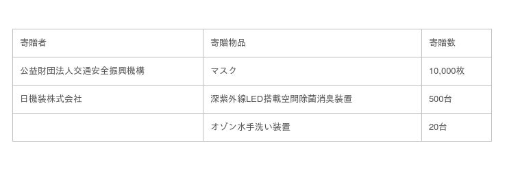 2020-05-08 東京都 マスク等の寄贈について Tweet ~新型コロナウイルスに関する東京都からのお知らせ~ この度、下記寄贈者から東京都に、マスク等の寄贈がありましたので、お知らせします。なお、寄贈物品は医療機関等で活用させていただきます。 [表: https://prtimes.jp/data/corp/52467/table/323_1.jpg ] 企業プレスリリース詳細へ PR TIMESトップへ 公式ツイッター Follow @Straightpress 最新情報をTwitterで受け取ろう! 公式フェイスブックページ 最新情報をFacebookで受け取ろう! 前の記事 一覧へ戻る 次の記事