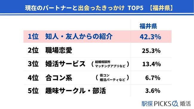 全国20代~60代の既婚男女10,176人に、現在のパートナーとどこで出会ったのか調査を行った結果、福井県の1位は「知人や友人からの紹介(42.3%)」、2位は「職場恋愛(25.3%)」でした。