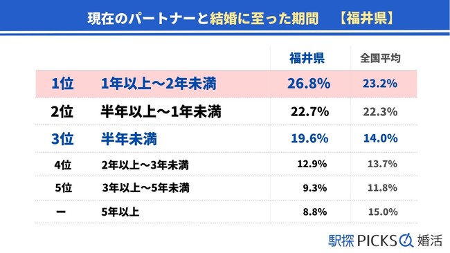 福井の人が結婚までに至った期間は「1年以上~2年未満」が最多、「半年未満」の人も多い傾向