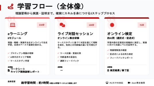 従来の「週末1日完結型(6時間)」から、「eラーニング+オンラインワーク」のハイブリッド型へ移行し、時間や場所に縛られず、AIを活用した最新のキャリア開発を体験できる新体制での提供を開始します。