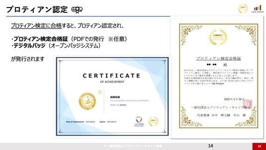 学習内容の定着度を客観的に測定します。検定に合格すると「プロティアン認定」として合格証およびデジタルバッジ(オープンバッジ)が発行されます。