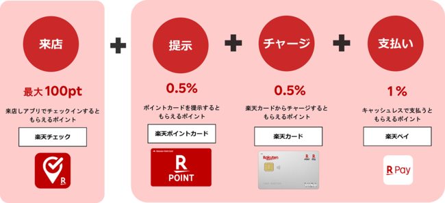 これにより、利用者は店内の指定エリアで「楽天チェック」アプリを起動しチェックインすると、くじ形式で「楽天ポイント」を最大100ポイント獲得することができるようになります。