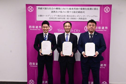 千葉県四街道市(市長:鈴木陽介、以下「四街道市」)、日揮ホールディングス株式会社(代表取締役会長兼社長CEO 佐藤 雅之、以下「日揮HD」)、株式会社レボインターナショナル(代表取締役CEO:越川 哲也、以下「レボインターナショナル」)および、合同会社SAFFAIRE SKY ENERGY(代表者:高田 岳志、以下「SAFFAIRE SKY ENERGY」)は、持続可能な航空燃料SAF(Sustainable Aviation Fuel、以下「SAF」)の原料となる使用済み食用油(以下「廃食用油」)の資源化促進を図るため、「持続可能な航空燃料の普及促進に関する連携と協力に関する協定」(以下「本協定」)を2026年3月30日に締結し、同日、四街道市役所内にて協定締結式を執り行いました。