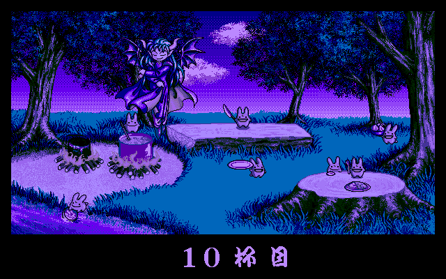 本作は1992年にリリースされた『ディスクステーション98#12』に収録されていた観賞用ソフトです。ある森を舞台に、軽快な曲にあわせて6人(?)のカーバンクルが、カレーを調理し、ひたすら食べる様子が楽しめます。昼夜お構いなしに続くカレーの宴はいつまで続くのでしょうか……? さらに、時々サタン様やアルルの姿も見られるので、ぜひそのチャンスは見逃さないようにしましょう。BGVの中では高い人気を誇っており、後にブックタイプのディスクステーション#13にも再収録されました。