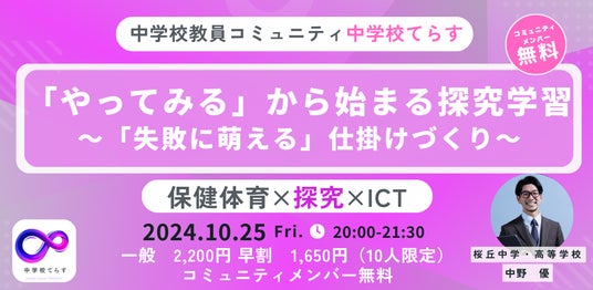 株式会社NIJIN(本社:東京都江東区、代表取締役:星野達郎)が運営する「中学校てらす」は、オンラインセミナー『「やってみる」から始まる探究学習 ~「失敗に萌える」仕掛けづくり~』を開催いたします。