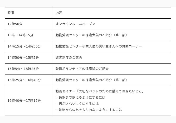 ご自宅等からインターネットでご参加いただける保護犬や保護猫のオンライン譲渡会を開催します。保護犬や保護猫の普段の様子をご覧いただけるとともに、チャットによる質問やリクエストができます。毎回、初参加の方も多く、当日は、保護犬や保護猫をお披露目するのみですので、譲受をまだ検討していない方や、県動物愛護センターの活動についてお知りになりたい方など、みなさまお気軽にご参加ください。