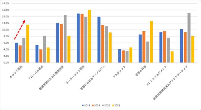 一方、ATD(※1)カンファレンス(世界最大の人材開発カンファレンス)におけるアジェンダ数の割合推移(下記図1参照)を見ると「キャリア開発」アジェンダの順位は2018年と2019年には8位だったが、2020年に6位、2021年には3位にランクインするなど個人のキャリア開発は世界的にも注目されている。企業のDX推進に紐づく個人のリスキルも広義ではキャリア開発と言えるだろう。