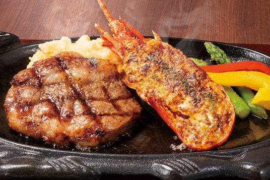 黄金焼きで仕上げた濃厚でプリプリ食感のロブスターと、和牛の旨味を存分に味わえる黒毛和牛サーロインステーキ、または厚切りでボリューム満点の熟成サーロインステーキを組み合わせた華やかなメニューです。