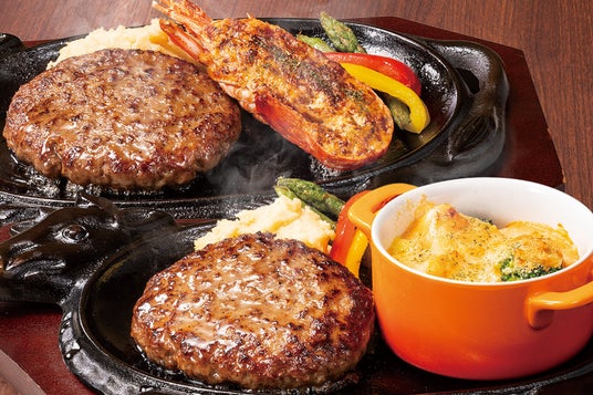 ハンバーグ派のお客様には牛100%の本格ハンバーグと2種のシーフードメニューとのコンビもご用意しております。
