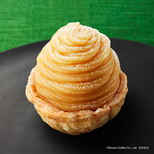 パイ生地に紅天使のしっとり生地を流し入れ、焼き上げた土台の上にホイップクリームをのせ、外側に紅天使のモンブランクリームを絞り、天面に粉糖をトッピングしました。