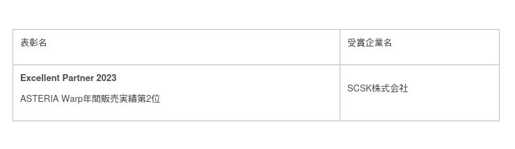アステリア株式会社(本社:東京都渋谷区、代表取締役社長:平野洋一郎、証券コード:3853、以下 アステリア)は、2023年3月期においてASTERIA Warpビジネスに大きな功績を残したパートナーを表彰する「ASTERIA Warp Partner Award 2023」を決定し、パナソニック インフォメーションシステムズ株式会社、SCSK株式会社、株式会社システナ、株式会社DTS、株式会社Box Japan、株式会社ニックスの計6社が受賞したことを発表します。