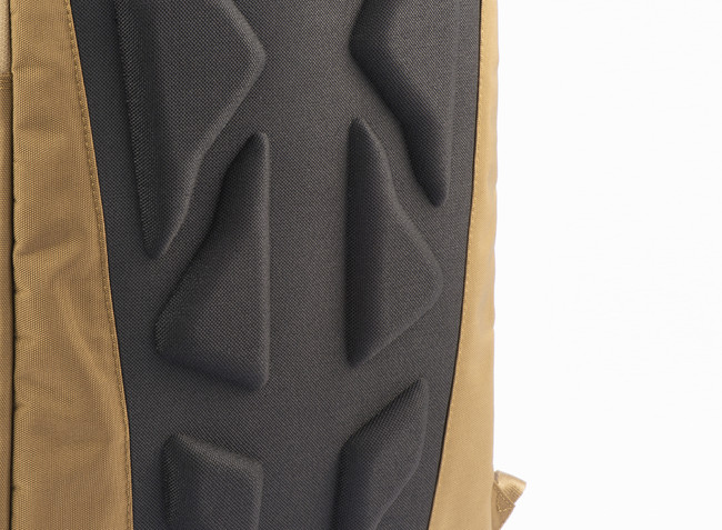 リュック型の背面に凹凸のあるクッション材を使用することで、荷重を分散するとともに空気の通り道を確保し、放熱性を向上させることで背中の蒸れを軽減するエアベンチレーション構造を採用しています。
