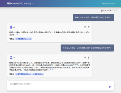 MJSが社内採用したAure OpenAI Serviceを用いた『専用ChatGPTソリューション』は、MJSとグループ会社の株式会社エヌ・テー・シー(本社:新潟県長岡市、代表取締役:岩本均、以下「NTC」)が共同で構築を進めたAIチャットサービスです。これまでに蓄積された問い合わせ履歴やお客さま情報、社内資料などのあらゆる情報が格納された独自のデータベースに社内ポータルから接続し、社員のリクエストに対して最適な文書を要約して返答します。本サービスはプライベートなネットワーク環境で使用するため外部からアクセスはできず、セキュアな状態で情報漏えいリスクを低減します。また、入力したデータが一般公開のChatGPTにおいて学習データとして利用されるリスクもありません。