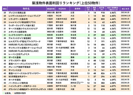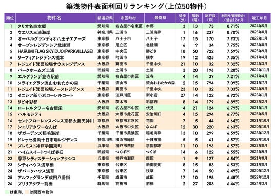 今回は当社のRealnetマンションサマリで算出することができる直近1年間に分譲賃貸マンションとして賃貸流通した部屋の賃料とその部屋の新築時価格から算出される物件毎の平均表面利回りを使い、築5年以内の築浅分譲マンションに限定して、利回りが良い物件順にランキング形式でまとめました。