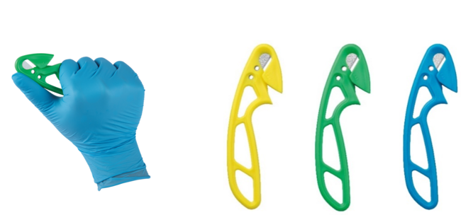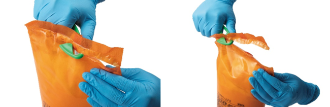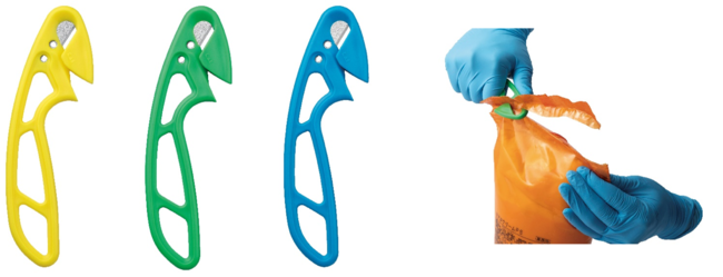 「異物混入対策フックナイフ」の一番の特徴は、従来使用されてきたハサミやペティナイフ等で発生しやすい二度切りリスクを抑制し、ワンストロークで袋を開封しやすくした点です。これにより、二度切りによる包材片(ビニール片)の異物混入の発生防止に効果的です※1 。