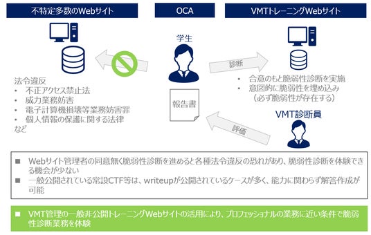 VMTは、実体験が困難な脆弱性診断業務を学生に体験していただく課題を提供いたします。VMTで保有しているトレーニングサイトをOCAの学生向けに開放し、脆弱性診断を実施、診断結果をレポーティングしていただきます。報告書はVMTの診断員が内容を確認し評価いたします。