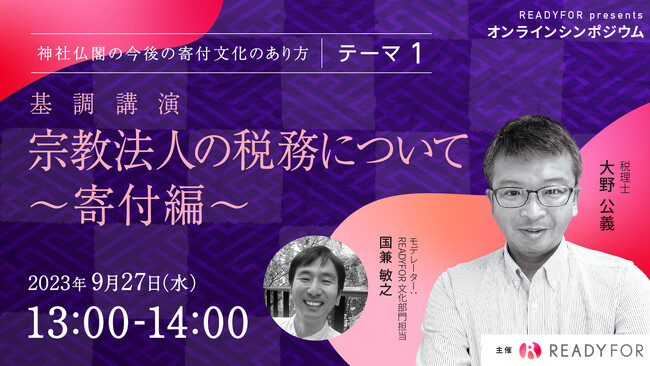 日本初・国内最大級のクラウドファンディングサービス「READYFOR」を運営するREADYFOR株式会社は、2023年9月27日(水)にオンラインシンポジウム「神社仏閣の今後の寄付文化のあり方」を開催いたします。