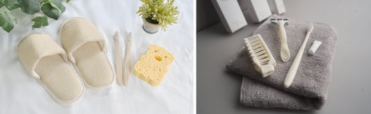 (左)こども用アメニティとして展開中のスリッパ・歯ブラシ・ボディスポンジ(右)とうもろこし素材を活用したアメニティシリーズ