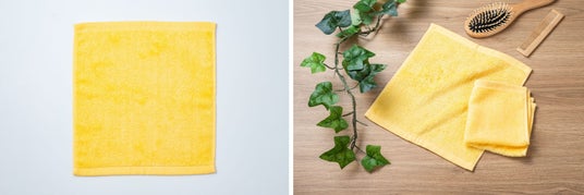 (左)縦横25cmの正方形型(右)客室に映えるイエローカラーを採用
