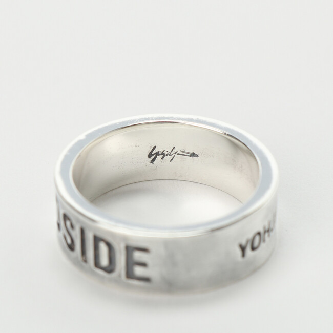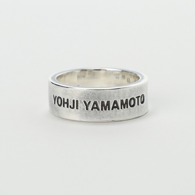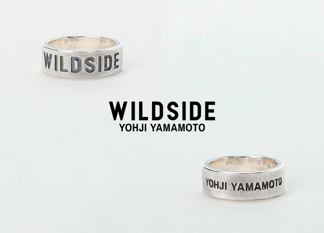 シルバー950素材を使用したフラットなリングの外周に、「WILDSIDE YOHJI YAMAMOTO」のロゴを大胆に彫り、彫った文字部分に墨を入れて、エイジング加工を施しました。内側には「Yohji Yamamoto」のロゴも刻印されており、適度な厚みとボリューム、マットな質感で、シンプルなデザインながら、さりげない存在感を手元に沿えます。