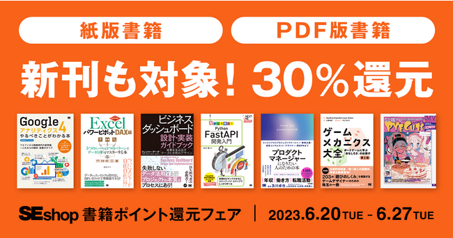 株式会社翔泳社(本社:東京都新宿区⾈町5、社長:佐々木幹夫)の運営する公式通販サイトSEshopは、 2023年6月20日(⽕)から6月27日(⽕) まで紙版書籍・PDF版電子書籍の新刊含む2600タイトルが30%ポイント還元となる「書籍ポイント還元フェア」を開催します。