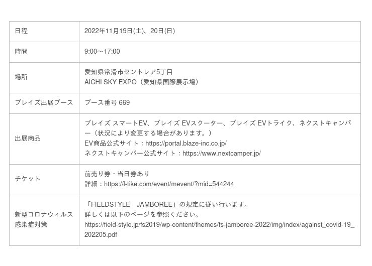 株式会社ブレイズ(愛知県名古屋市、代表取締役:市川秀幸、以下ブレイズ)は、2022年11月19日(土)・20日(日)に「AICHI SKY EXPO 愛知県国際展示場」にて開催される「FIELDSTYLE JAMBOREE(フィールドスタイル ジャンボリー)」に、協賛スポンサーとして出展することお知らせします。
