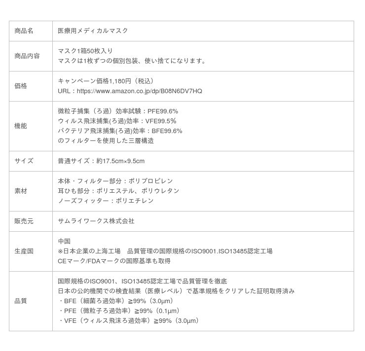 サムライワークス株式会社(代表取締役社長:新島 実 本社所在地:東京都渋谷区)は、10都府県で緊急事態宣言の延長が決定され、さらなる感染拡大の被害を最小限にとどめる手助けとなればという思いから、医療現場でも使われる高品質で高密度の医療用不織布マスクを一般家庭でもご使用いただけるよう『医療用メディカルマスク』をamazonにて数量限定で販売致します。さらに即日出荷で急ぎで欲しい場合も便利です!『医療用メディカルマスク』は、品質管理の国際規格ISO9001、ISO13485の認定工場で、徹底した品質管理の基に製造を行い、徹底した品質管理で製造されたマスクの性能を日本の検査機関で厳しい検査を受け、PFE99.6%、BFE99.6%、VFE99.5%と医療用としての規格基準を大幅に上回った証明取得済のマスクです。