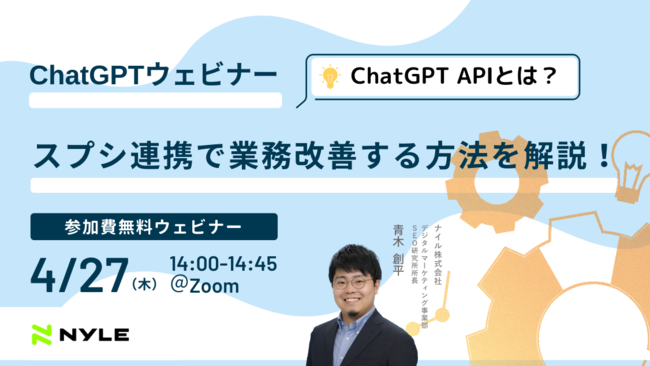 マーケティングDX事業を営むナイル株式会社(本社:東京都品川区、代表取締役:高橋 飛翔、以下、ナイル)は、ChatGPT APIを利用し、Googleスプレッドシートに連携する方法から、業務改善する方法までをわかりやすく解説するウェビナーを、4月27日(木)14:00より無料にて開催します。