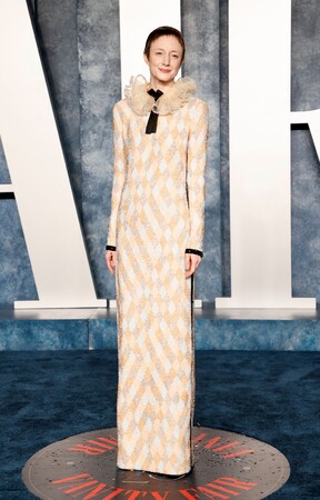 マイケル・モリス監督作「To Leslie」アカデミー主演女優賞に初ノミネートされた主演女優賞にノミネートされたAndrea Riseborough(アンドレア・ライズボロー)は、ジョルジオ アルマーニ プリヴェの刺繍が美しいエクリュのラッフルカラーがアクセントのパステルカラーのハーレクイプリントのロングスリーブのビーズドレスを着用しました。