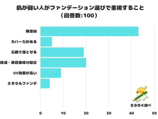 肌が弱い人がファンデーション選びで重視することをアンケートにて調査したところ、1位は「無添加」でした。