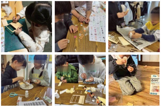 届いたミニチュアハウス組み立てキットを体験する子どもたちの様子