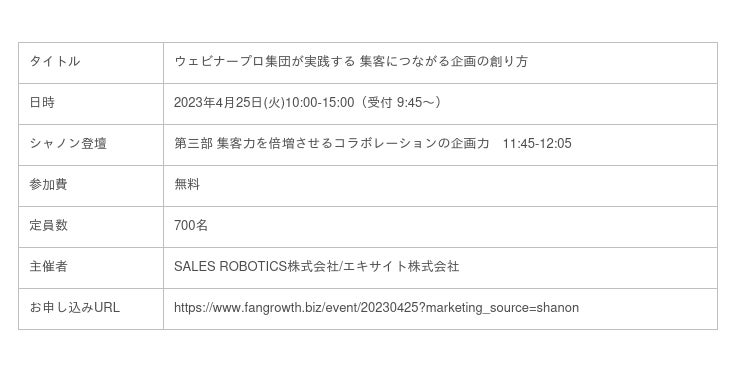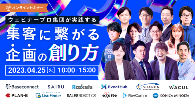株式会社シャノン(本社:東京都港区、代表取締役社長:中村 健一郎)は、SALES ROBOTICS株式会社・エキサイト株式会社が主催する4月25日(火)開催のウェビナー「ウェビナープロ集団が実践する 集客につながる企画の創り方」に登壇いたします。