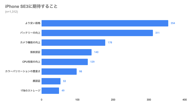 iPhone SE3に最も期待されているのは、「より安い価格」で354票を集めました。次いで「バッテリーの向上」が311票となっています。