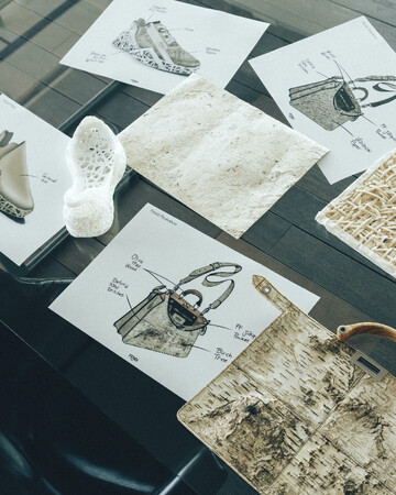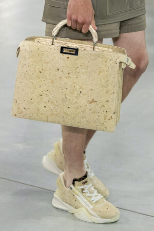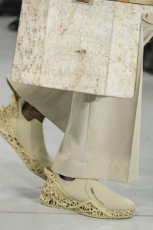 隈氏は他にも、細い竹をイレギュラーに編み上げる「やたら編み」を思わせる手法で、強固な格子を編み上げました。この日本の伝統が「和蘭紙ピーカブー」の内側のフレームに用いられ、またアッパーにリサイクルされたポリコットンニットまたは和蘭紙を用いた「フェンディ フロー」スニーカーの3Dプリントによるソールにインスピレーションをもたらしています。「フェンディ フロー」はシューレースまたはファスナーがあしらわれたアッパー、コルクのインソール、未染色のバイオベースEVAを用いた「FF」ロゴソールに再解釈されています。