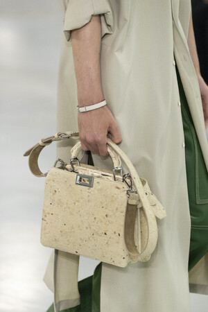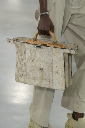「ピーカブー(Peekaboo)」と「バゲット ソフト トランク(Baguette Soft Trunk)」バッグ、「フェンディ フロー(Flow)」スニーカーにフォーカスし、隈研吾氏は古の日本のクラフツマンシップと天然原料を用い、フェンディのアイコンにわずかに革新的な新しいバージョンを生み出しました。隈氏は、昔の手すきの紙を思わせる、コットンと樹皮繊維から作られる和紙のハイブリッドスタイルである「和蘭紙」を、主な介入要素として各デザインに用いました。伝統的に折り紙や提灯、また着物のディテールに用いられるこのドライでソフトな質感のファブリックは「ピーカブー」、「バゲット ソフト トランク」、「フェンディ フロー」スニーカーの不均一で不完全なファサードとともに強力な構造的基礎を形成し、人工物を自然に一体化させるという隈氏の哲学に共鳴しています。ふたつめの「ピーカブー」のデザインは、トスカーナのオリーブの木を彫り出した内側のフレームとともに、フェンディのアイコニックな「ペカン(Pequin)」ストライプに控えめに敬意を表した、淡いシラカバ樹皮の良質なかせで構成されています。