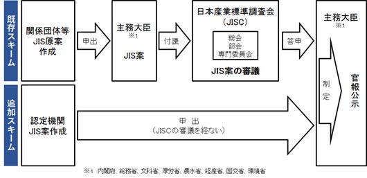 本スキームは、JIS制定の民間主導による迅速化を目的としたものです。主務大臣が認定した、標準化の専門知識と能力を有する民間の認定機関から申出するJIS案については、日本産業標準調査会(JISC)の審議を経ずに迅速に制定することができます。