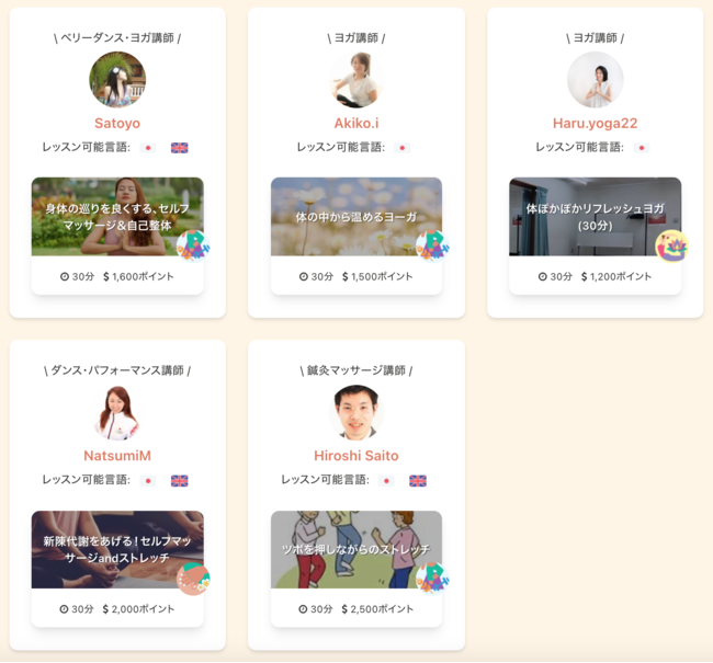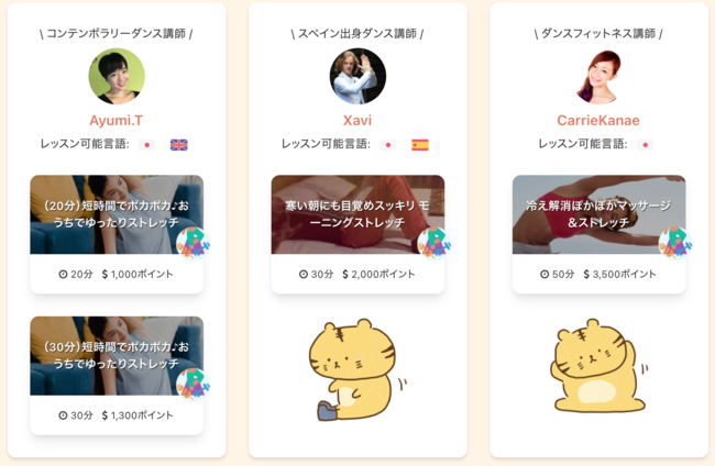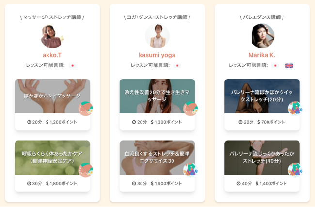 現役バレリーナが教える「バレリーナ流ぽかぽかクイックストレッチ(20分)700ポイント(770円税込)、スペイン出身のダンス講師による「寒い朝にも目覚めスッキリ モーニングストレッチ(30分)2,000ポイント(2,200円税別)、現役鍼灸マッサージ師による「ツボを押しながらのストレッチ」(30分)2,500ポイント(2,750円税別)など、カフェトークならではのバラエティ豊かなレッスンが揃っています。