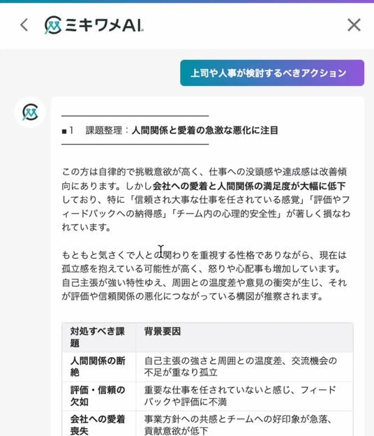 私たちは日々お客様と向き合う中で「測るだけでは、人は変わらない」ということを学びました。だからこそ「ミキワメAI」は、社員一人ひとりの性格特性とコンディションを可視化するだけでなく、具体的な行動指針をAIが提示する、導くプロダクトへと進化してきました。