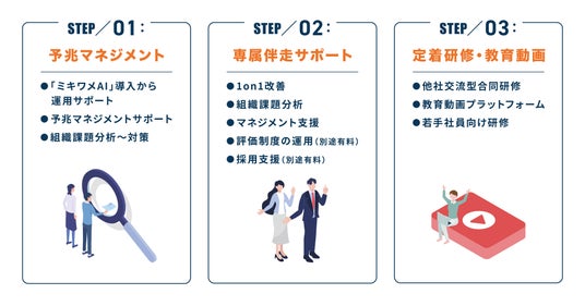 「ミキワメAI」を導入し定期的な性格診断やサーベイを通して、社員一人ひとりのコンディションを可視化し、離職の兆候を早期に察知します。またその改善に向けて、社員個人の性格・メンタル状態を踏まえたアドバイスをお出しさせていただきます。