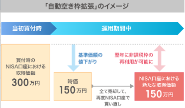 基準価額が下落した証券投資信託を自動で一旦売却し再購入することにより、非課税保有限度額である生涯投資枠の空き枠を拡げるオプション機能です。
