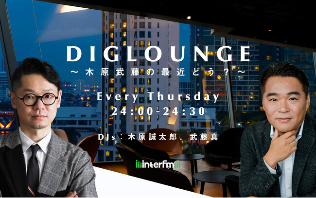 インターエフエム(東京:89.7MHz 横浜:76.5 MHz)は、2024年4月スタートの新番組として、リサーチプロデューサー木原誠太郎と、企業経営者の武藤真がDJを務める新番組 『DIGLOUNGE ~木原武藤の最近どう?~』 の放送をスタートいたします。