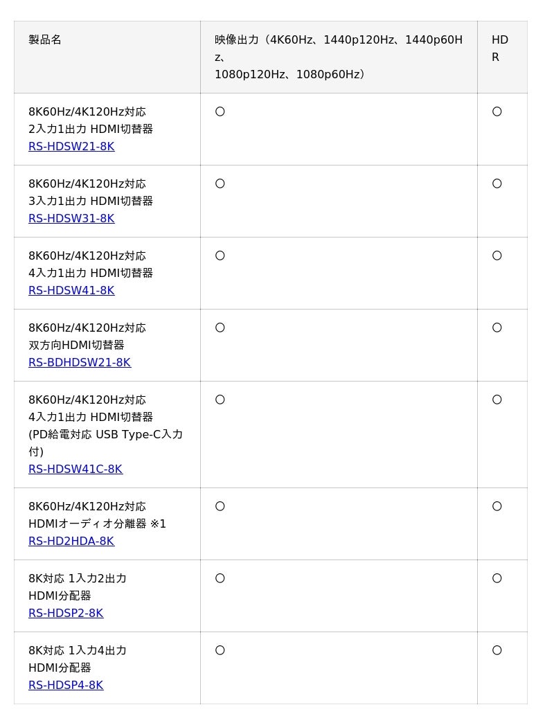 ※表に記載がない製品は、動作確認をおこなっていない、もしくは使用できません。