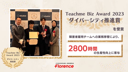 認定NPO法人フローレンス(東京都千代田区、代表理事:赤坂緑)は、マニュアル作成・共有システム「Teachme Biz(ティーチミー・ビズ)」を提供する株式会社スタディスト(本社:東京都千代田区、代表取締役CEO:鈴木悟史)が主催する「Teachme Biz Award 2023」において、マニュアルを活用して障害のあるスタッフの活躍の幅を広げ、法人全体の生産性も向上させたことが評価され、ダイバーシティ推進性を受賞いたしました。