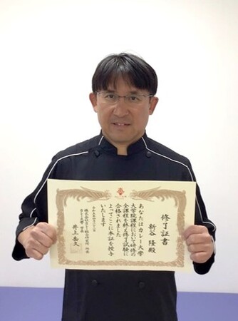 大学院での講義の中で、特に調理学でプロの細やかな指導を受け、「スパイスの奥深さ、カレーへの向き合い方など、プロの調理にかける真剣な姿勢に尊敬と感動を覚えました。」と、たくさんの刺激と学びを得られたそうです。今後は、和牛の更なる需要拡大のため、「焼肉店が提供するカレー」の開発など、地域の活性化にも役立つ「儲かるカレー」を目指したいと熱く語ってくれました。