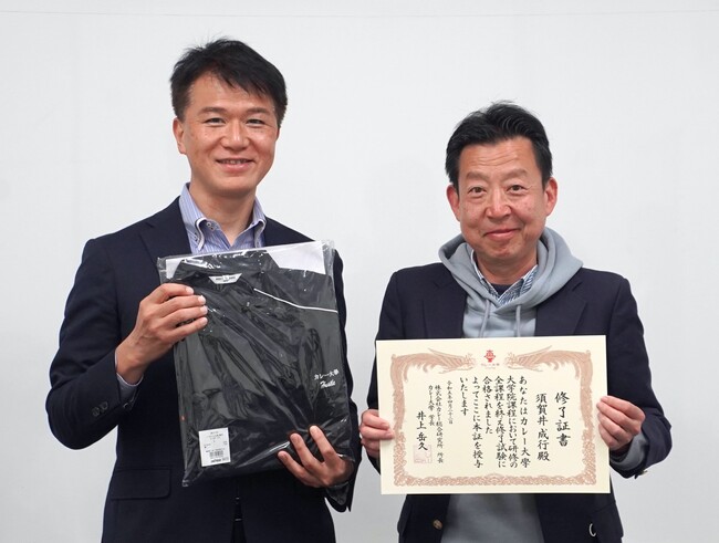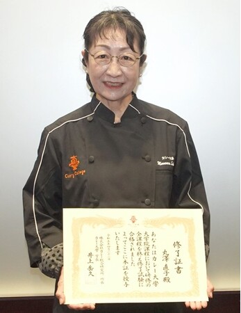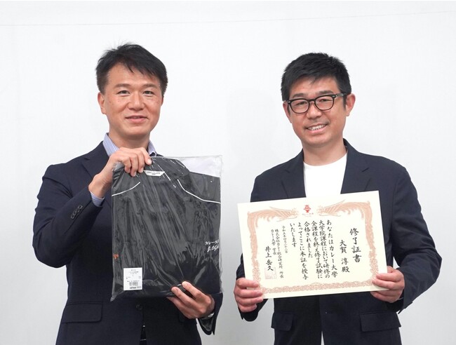記念のコックコートを贈る井上学長と修了書を持って笑顔の須賀井さん