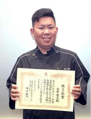 より専門的なカレーの知識と実践的な調理の技能を、井上岳久(いのうえ・たかひさ)学長やカレー調理のプロである銀座デリーの田中源吾(たなか げんご)特別教授)、スパイスの実践的な使用法の第一人者である井上スパイス工業社長の井上剛(いのうえつよし)特別教授などから学び、次の目標に向かう卒業生たちの修了証書授与式をレポートします。