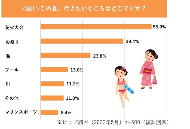 ▶この夏行きたいところとして、「花火大会(53.0%)」と回答した人が最も多く、